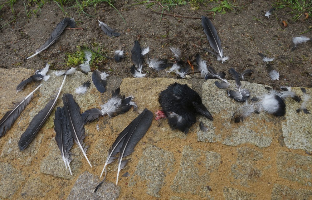 Mit dem Fernglasblick aus dem Dachbodenfenster war dann klar: Das Nest war gewaltsam geräumt worden, es hingen nur noch Federreste darin. Anhand von Fotos der Überreste identifizierten Wirth und ein Eulenexperte wieder den Uhu als wahrscheinlichsten Täter. Der Uhu hatte die Raben in der Nacht überwältigt, wobei ihm der Kopf heruntergefallen war.